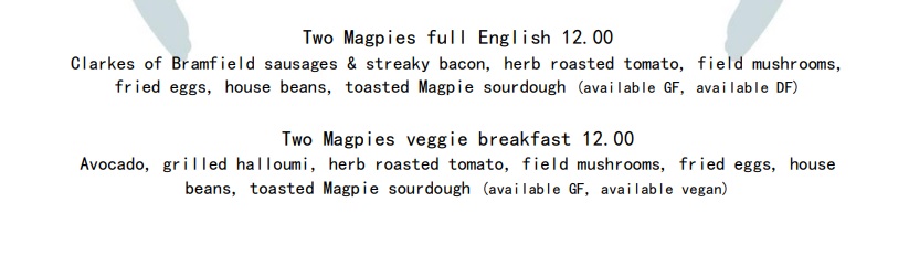 TWO MAGPIES FULL ENGLISH BREAKFAST