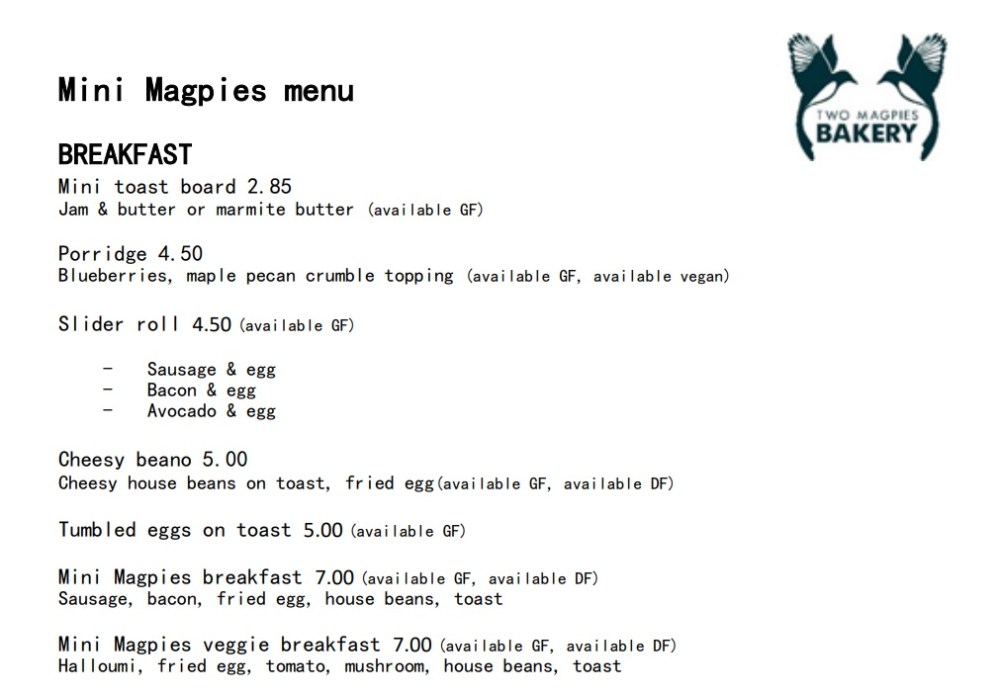 MINI MAGPIES BREAKFAST MENU