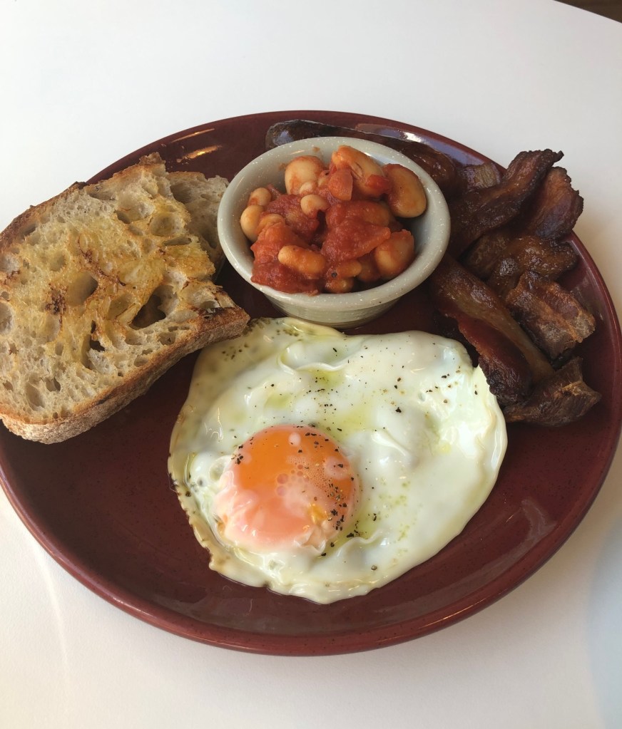 This was a plate of sausage, bacon, egg, house beans and toast. It was more of less a smaller version of the Full English that I ate, and we both had the same thoughts on the content.
