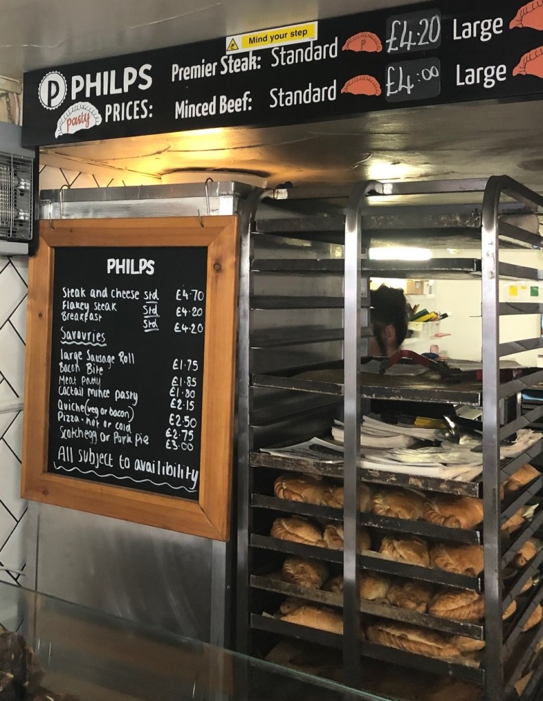 The pasty menu board threw up a slight dilemma as it was offering a meat pastie and a flaky steak pasty. I was confused as to whether that meant I could get one with a flakier pastry? I do kind of like that sort but we played by the rules and ordered a normal or standard meat pasty or maybe it was a flaky pastry one? I didn’t go inside so who know what we were getting