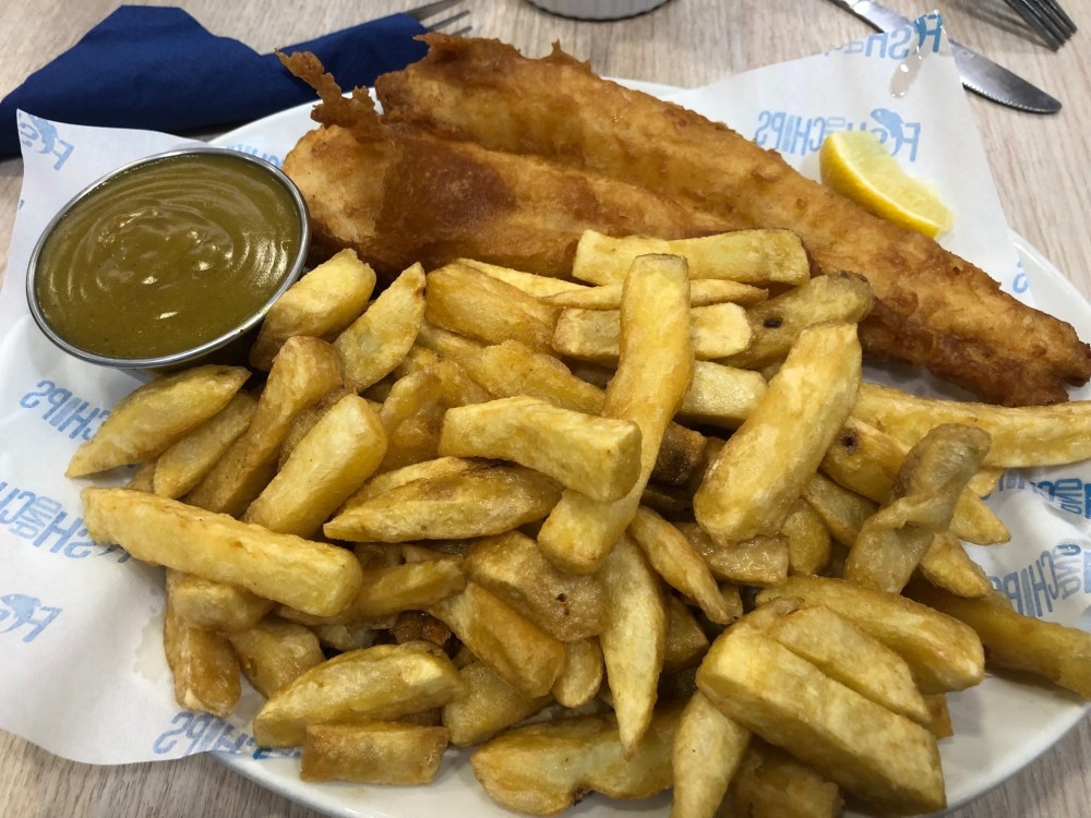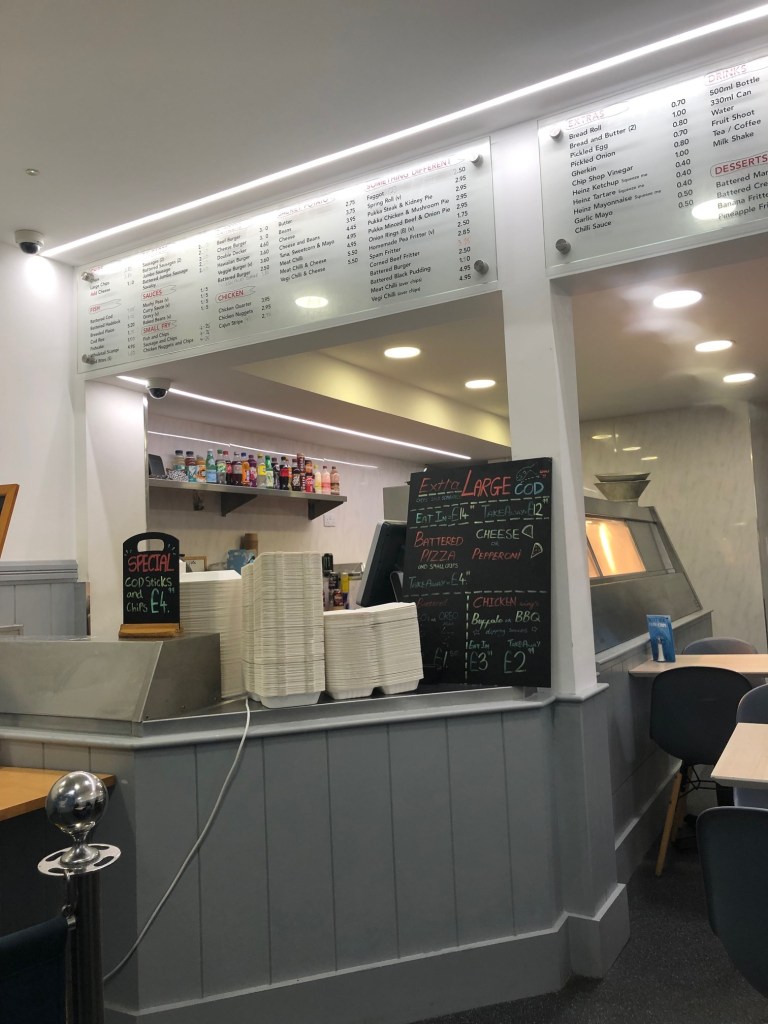We decided to get a Fish each but would just get one portion of chips to share. I ordered Cod in batter for £8.75, with large chips for £4 (it was just 40p more) and a pot of curry sauce for £1.50 (I was living on the edge)