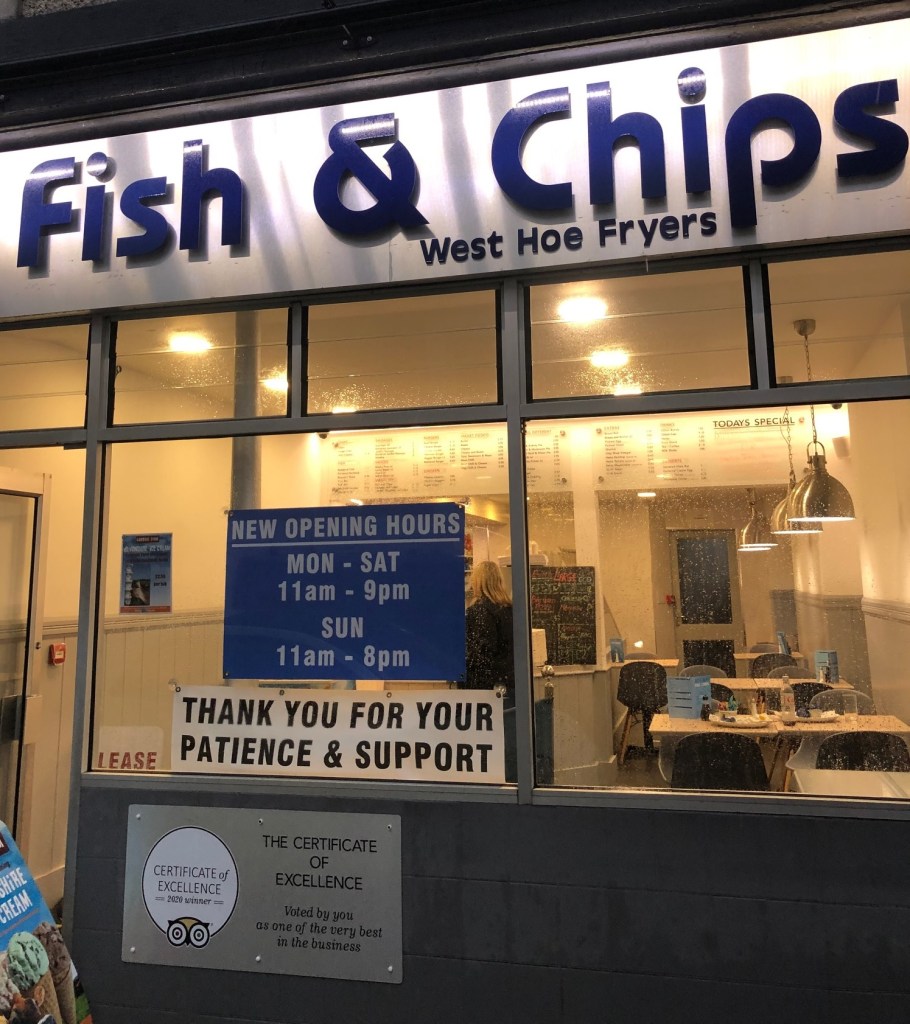The West Hoe Fryers in Plymouth was a most inviting sight when we were caught out in a massive rain storm the other day.