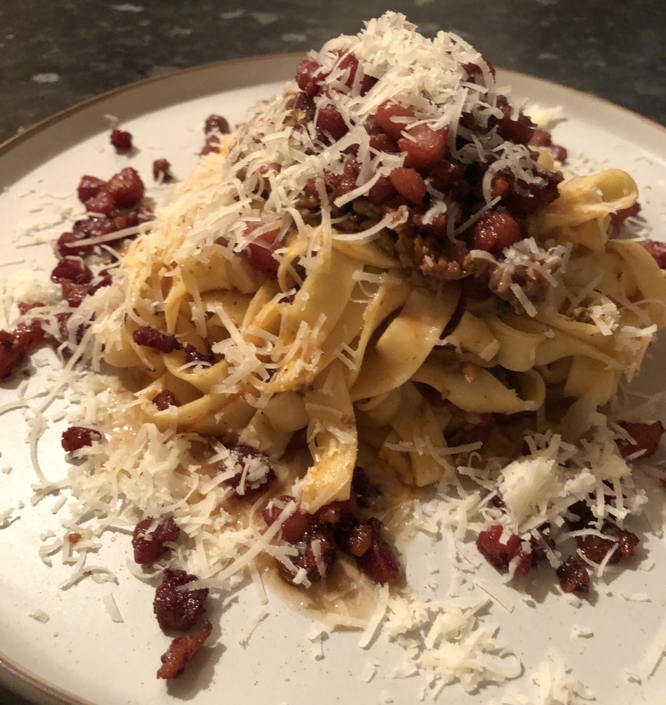 The correct amount should probably just be a sprinkle of crunchy cubed bacon joy but today for some reason I went the ‘whole hog’ adding pretty much the entire packet on top of my Bolognese mound.