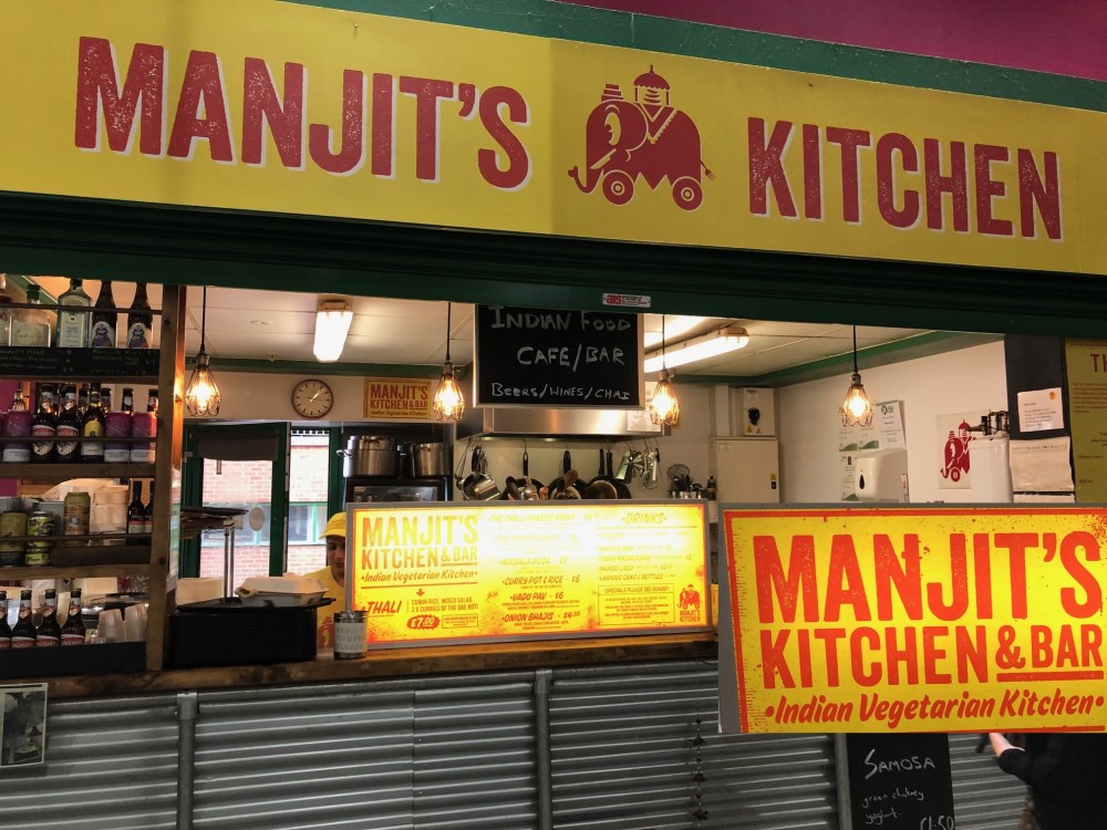 No trip to Leeds Kirkgate Market Foodhall would be complete without a visit to Manjit’s Kitchen & Bar, the brighly coloured Indian Vegetarian Kitchen located along the back wall of the hall draws the crowds and serves up some excellent food at exceptionally reasonable prices