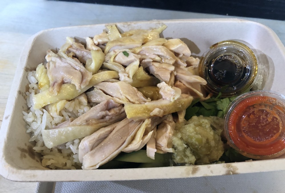 Along with the chicken, rice, cucumber, and ginger & garlic mix I also had two pots, one with a sweet soy sauce, and another with a gently spiced sambal of some sort (it might have been chilli garlic sauce).