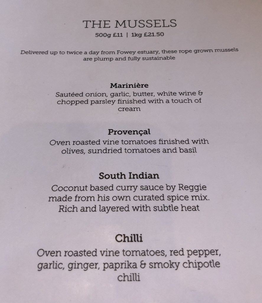 The website welcomed us with the offer of ‘Fresh Fish, Shellfish & of Course local mussels, from Padstow Estuary served with crusty sourdough bread or skinny fries’