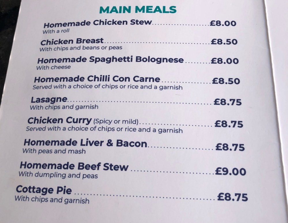 Elsewhere on the menu it was pleasing to find the word ‘Homemade’ feature so extensively with chicken stew, bolognaise, chili, stew and many more all on offer.