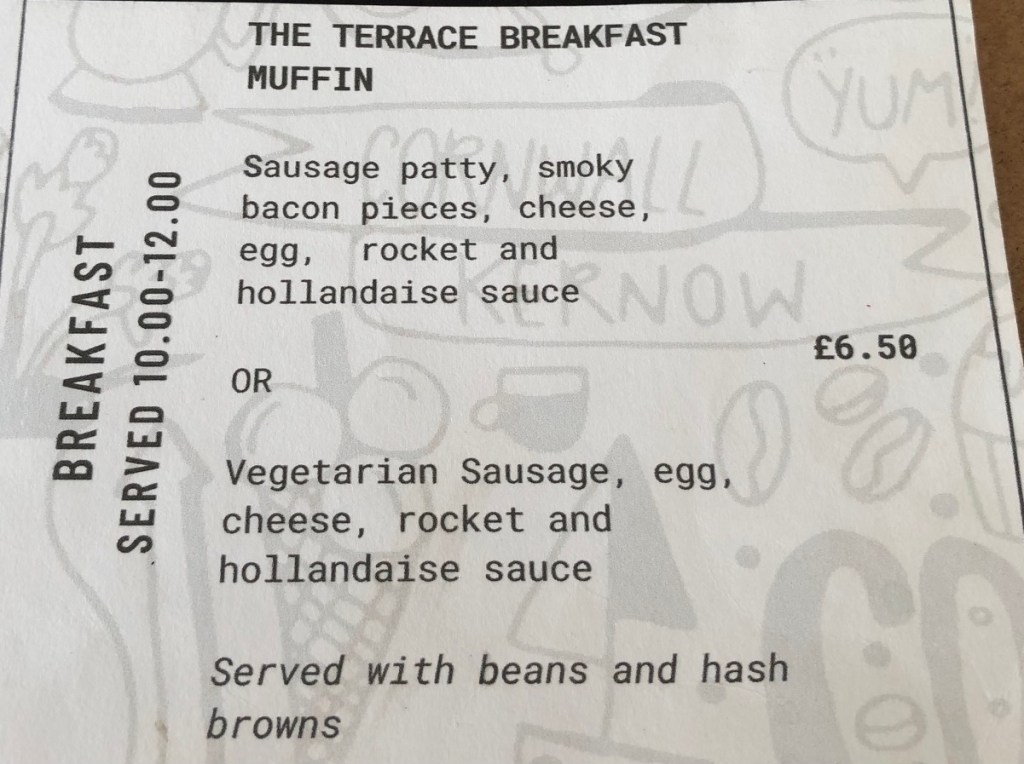 So it came to pass that we found ourselves looking at the Breakfast section of the menu (served between 10-12) happy that we had left early enough to drive down from Padstow to get here before they stopped serving it.