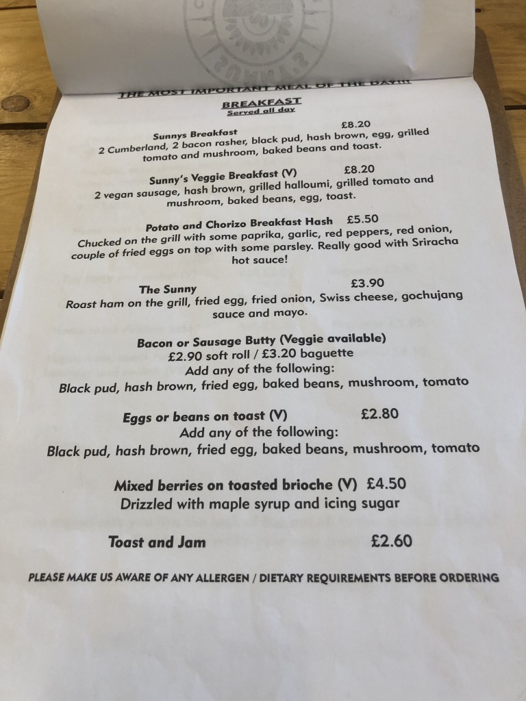I always have my eye on a fry-up so there was very little debate for my choice as I was looking at the Sunnys Breakfast of ‘2 Cumberland sausages, 2 bacon rashers, black pudding, hash brown, egg, tomato, beans, mushrooms, and toast‘ for £8.20