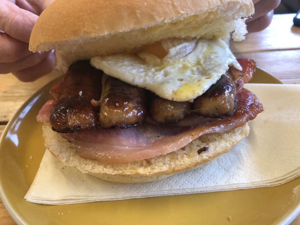 It did look good with two of those Cumberland sausages sliced lengthways placed in an orderly fashion upon two slices of bacon and topped off with a fried egg. All of it housed inside a big soft white cob or roll as they call it here