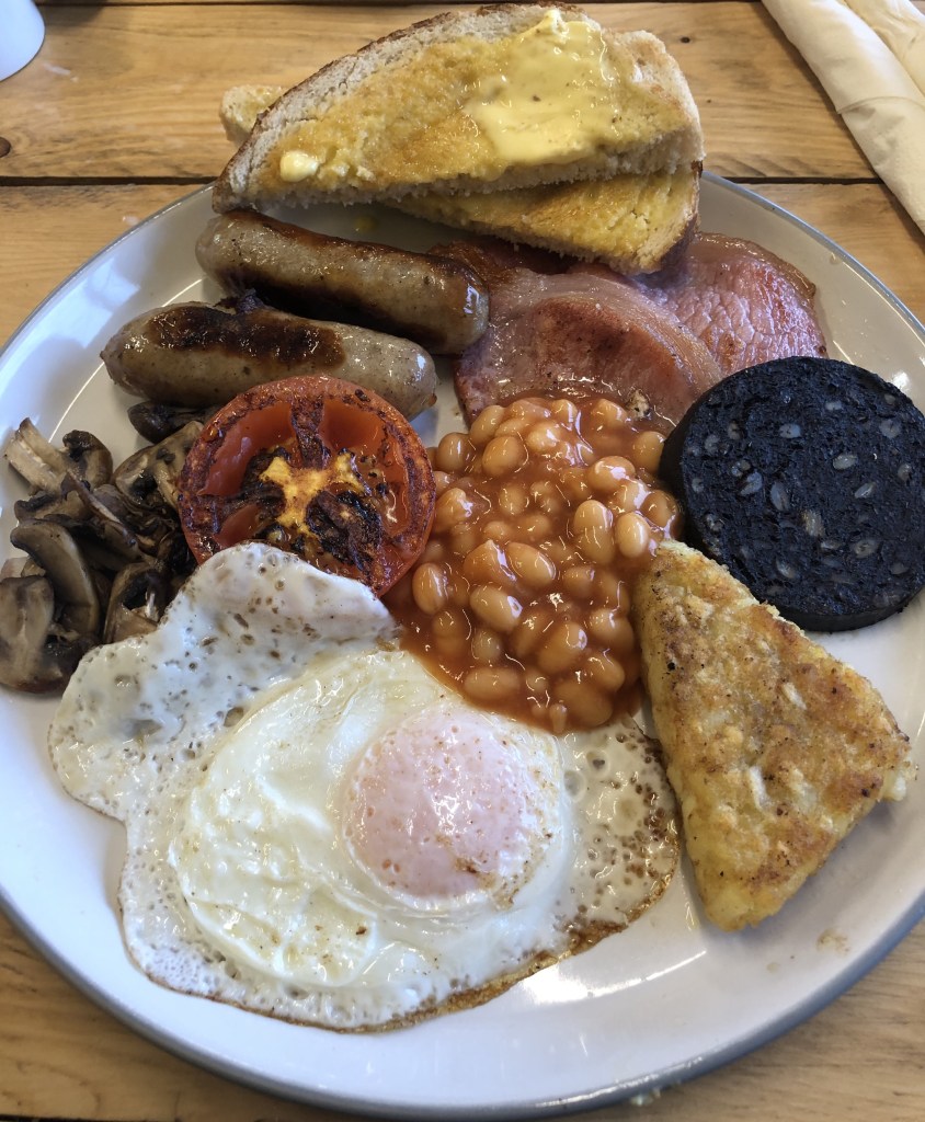 So it came to pass that I was staring down a plate filled with a couple of Cumberland sausages, two rashers of bacon, a slice of black pudding, fried egg, grilled tomato, hash brown beans, mushrooms, and two slices of very well buttered toast. My stomach rumbled with joyous expectation 🤣