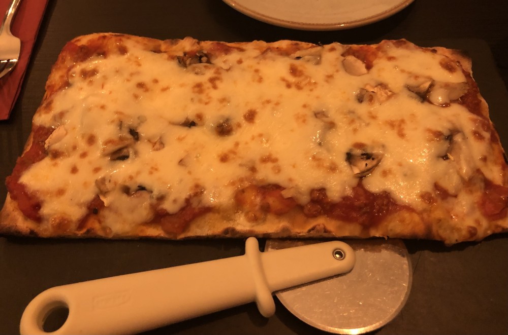 The second rectangle of Pizza that we shared was the Andrea Pizza described on the menu as toppings of “Tomato, Mozzarella, Mushrooms, Italian Sausage and Pepperoni”