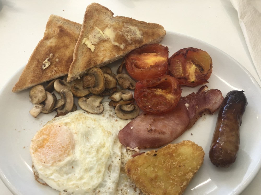 For £8.75 I was treated to a plate filled with “2 Bacon, 2 Sausage, 2 eggs, 2 hash brown, 2 toast, mushrooms, and beans”