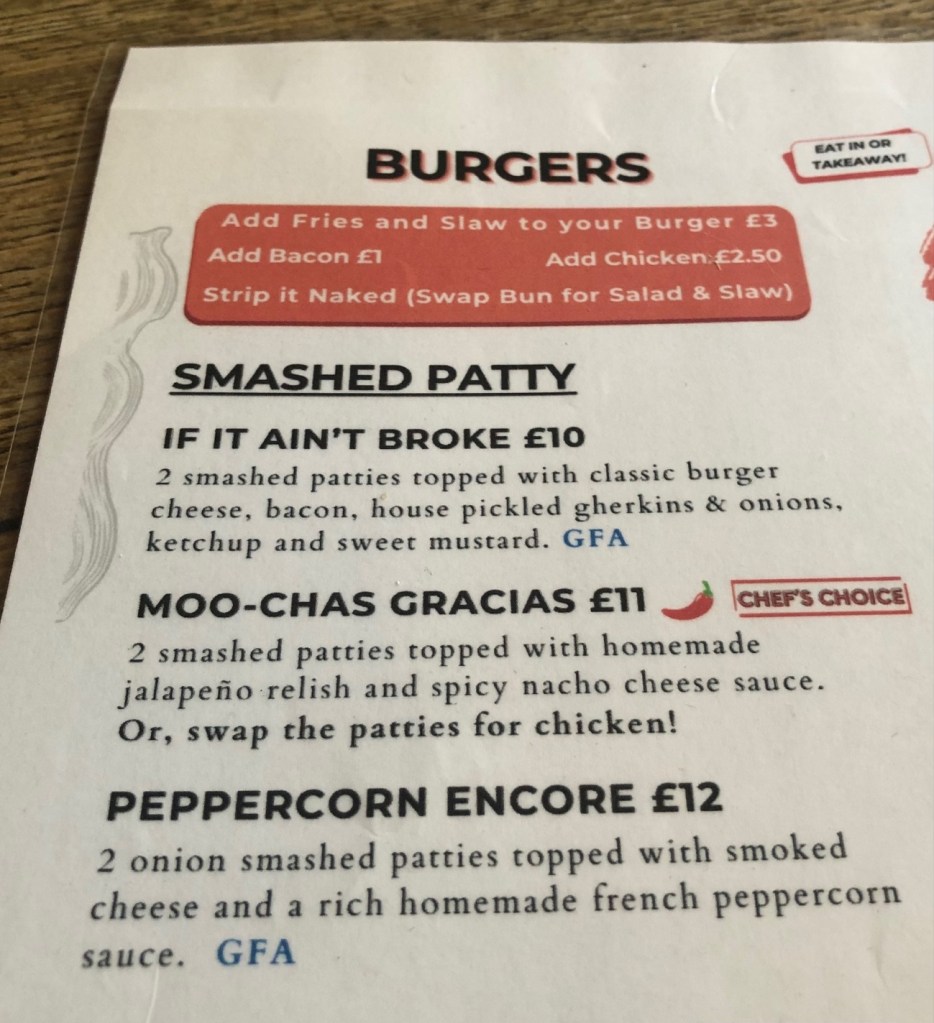 So here we were finally in the pub and ordering the classic offering “IF IT AIN’T BROKE” burger for £10.