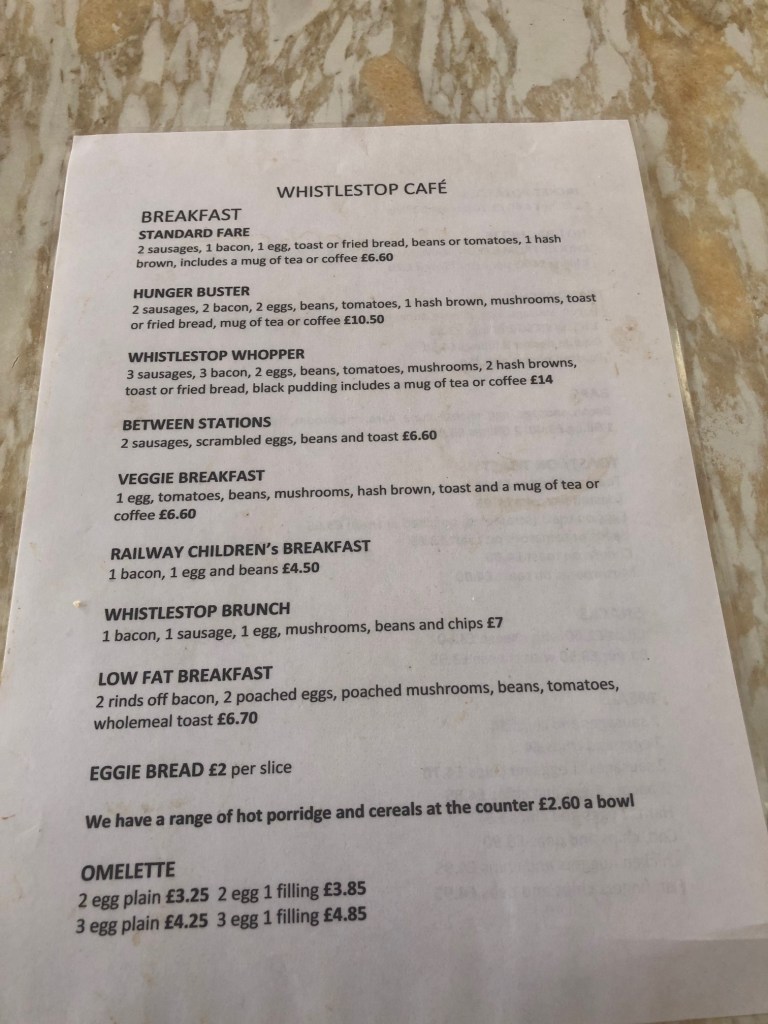 It so came to pass that I declined the opportunity to scoff one of their Whistlestop Whoppers which is a plate filled with “3 sausages, 3 bacon, 2 eggs, beans, tomatoes, hash brown, mushrooms, fried bread (or toast), black pudding and a cup of tea or coffee“