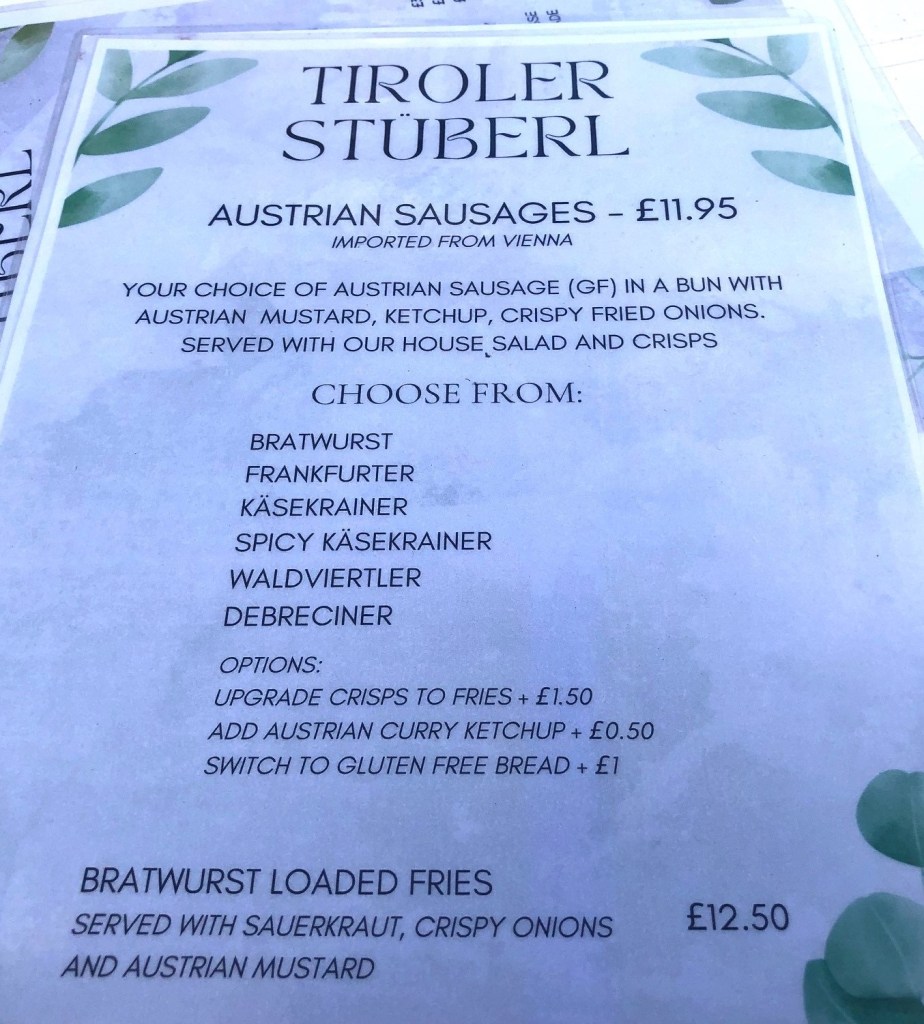 On our latest visit to Bakewell we were delighted to find that Tiroler Stuberl was back open again serving up Austrian sausage action. We always used to come here for a bit of cooked sausage in a bun when were were in the village and were quite sad when they had closed down
