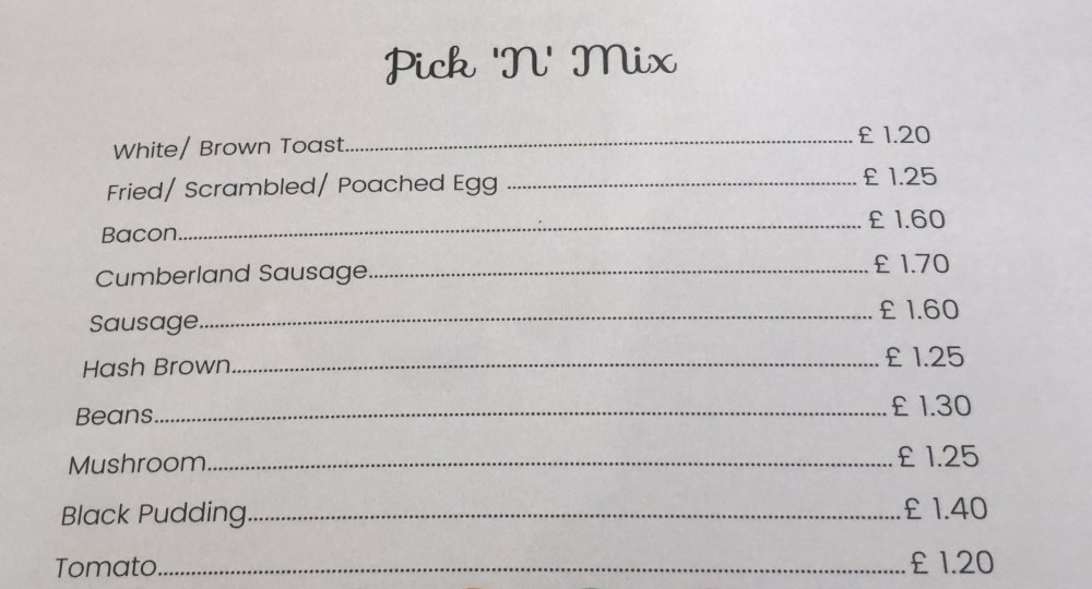 For the record I would have wanted 2 eggs, 2 sausage, 2 Bacon, Black Pudding, Beans and Toast so that would have cost me £11.60 so it was a close call and maybe one to consider for another day