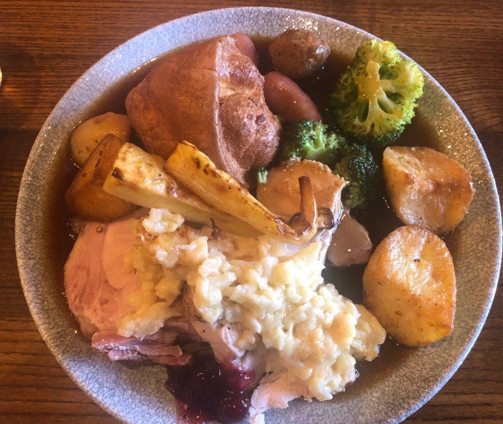Verdict. We had a good decent filling plate of food. There were ups and downs, the beef was tough but tasty, the turkey (normally my least fave) was juicy and pretty damn good, the ham spot on. Spuds a bit over, some veg a bit cold some a bit mushy some perfect, your typical buffet. Gravy I loved