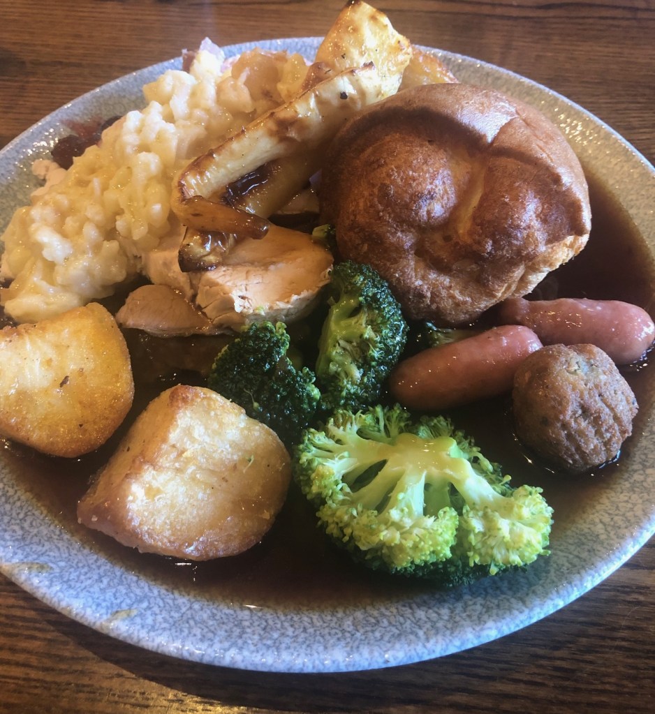 For me that was parsnips, broccoli, cauliflower cheese, and roast spuds then just Yorkshire Pudding, sausages, stuffing ball, and lashings of gravy