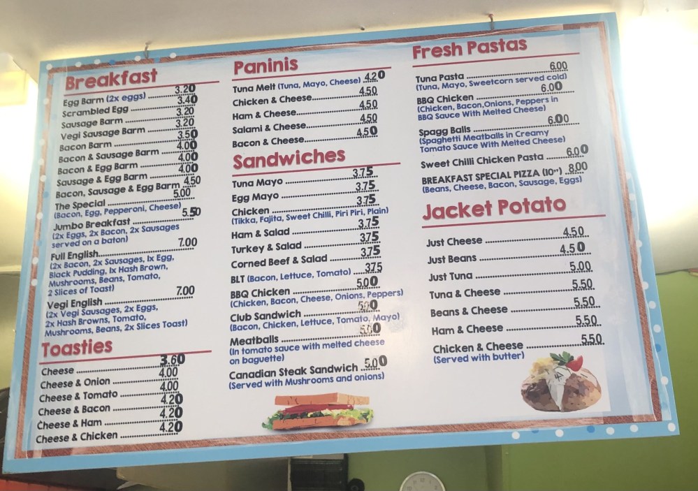 They also offer Panini, Sandwiches, Toasties, and Jacket Spuds filled and topped with all the classics, tuna, beans, cheese and variations upon