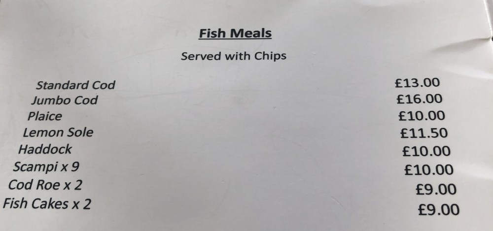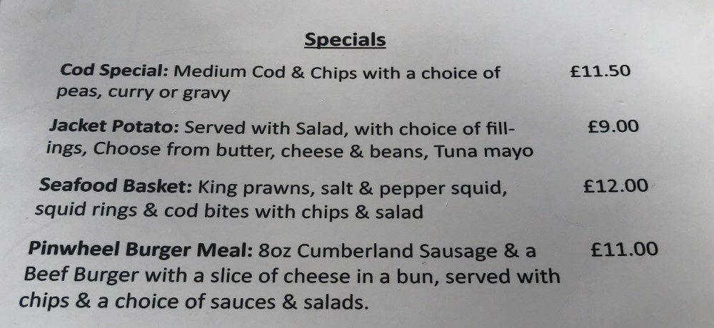 The Specials menu was tricking me out, I was trying to work out if it was a better deal to get the Cod Special for £11.50 that was a Medium Cod & Chips with Mushy Peas or whether to get the Haddock and Chips off the main menu for £10 and then add in a portion of mushy peas.