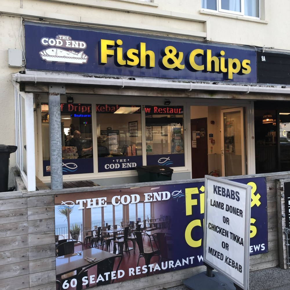 The Cod End Fish and Chip Restaurant is located at 9 Cliff Road in Newquay, Cornwall, TR7 2NE, just across the way from the Aldi and the Travelodge where we were staying