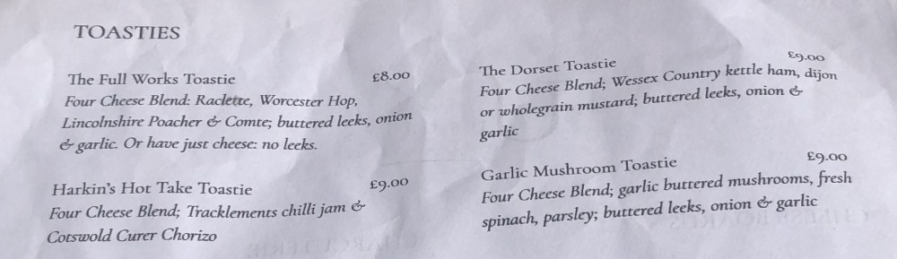 Then it was a straight choice between The Full Works Toastie and the Dorset Toastie. The Dorset lost out because of the mustard, gosh we sound so picky reading this back as I write up the post from my notes