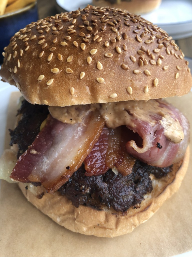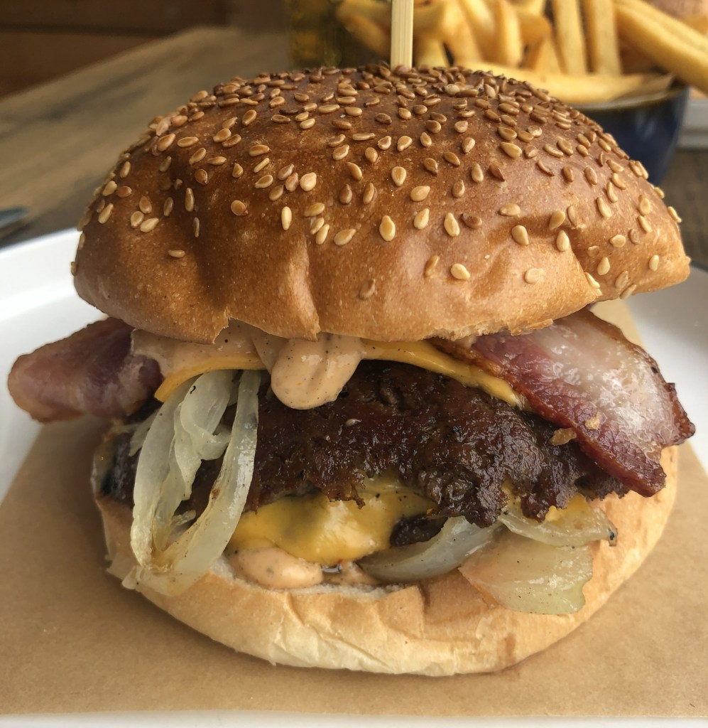 I opted for the Double Cheese and Bacon Burger for £12.50 described on the menu as “2 x 100% beef smash patties, smoked streaky bacon, American cheese, pickles, onions, and our secret burger sauce”