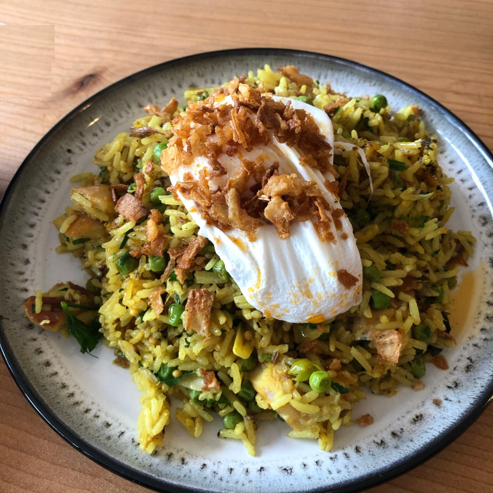 Officially this was listed as THE RAVEN – Smoked Mackerel Kedgeree, Rice, Peas, Poached Egg, Chili Oil for £12. I don’t know why it’s called the Raven but that’s incidental now I guess 🤔🤣